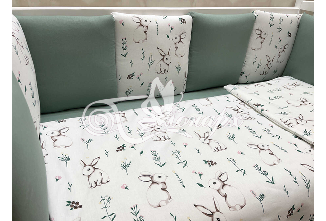 Бортик составной: 12 подушек 31х34 см на замочках упакованы в сумку-переноску.