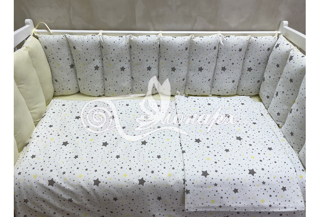 Бортики на замочках в кроватку: защитят Вашего малыша от ушибов, сквозняков, солнечных лучей и не дадут малышу запутаться в прутьях кроватки.