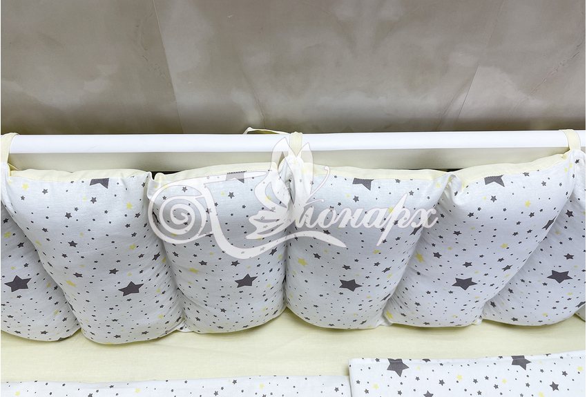 • Бортик-заборчик стеганый с синтепоном, плотно забит синтепухом (на замочках): - 2 шт. 60х34 см / - 2 шт. 120х34 см.
