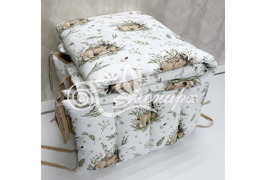 • Бортик-заборчик стеганый с синтепоном, плотно забит синтепухом (на замочках): - 2 шт. 60х34 см / - 2 шт. 120х34 см.